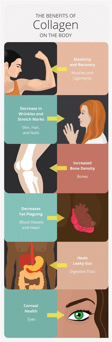 1. Skin Health: Collagen helps to improve skin elasticity, hydration, and firmness. It can reduce the appearance of wrinkles and promote a more youthful complexion. 2. Joint Health: Collagen acts as a cushion between our joints, reducing friction and preventing damage. It can help to alleviate joint pain and improve mobility. 3. Hair and Nail Health: Collagen strengthens hair follicles and promotes healthy hair growth. It also improves the strength and quality of our nails. 4. Gut Health: Collagen helps to repair and maintain the lining of our digestive tract, promoting optimal gut function and reducing issues such as leaky gut syndrome.
